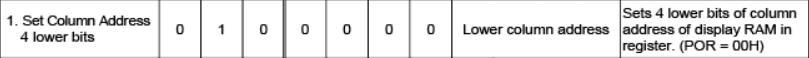 ③ 程序OLED_WR_Byte (0x0f,OLED_CMD)的0x0f是设置列的低地址,格式是根据设置列低地址(Set Column Address 4 Lower Bits)进行编写,该命令格式高四位的0000是固定的,而低四位则需要将程序指定的第16列的列地址0x0f(0000 1111)的低四位1111写入该命令的低四位,拼接起来就是0x0f,下图命令格式中的Lower column address就是列地址的低四位1111。
