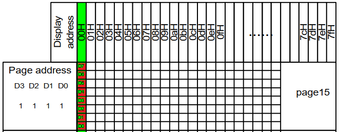 ① SH1107具有16页即page0-page15,每一页都为8行总共128行,也就是Seg0-Seg127