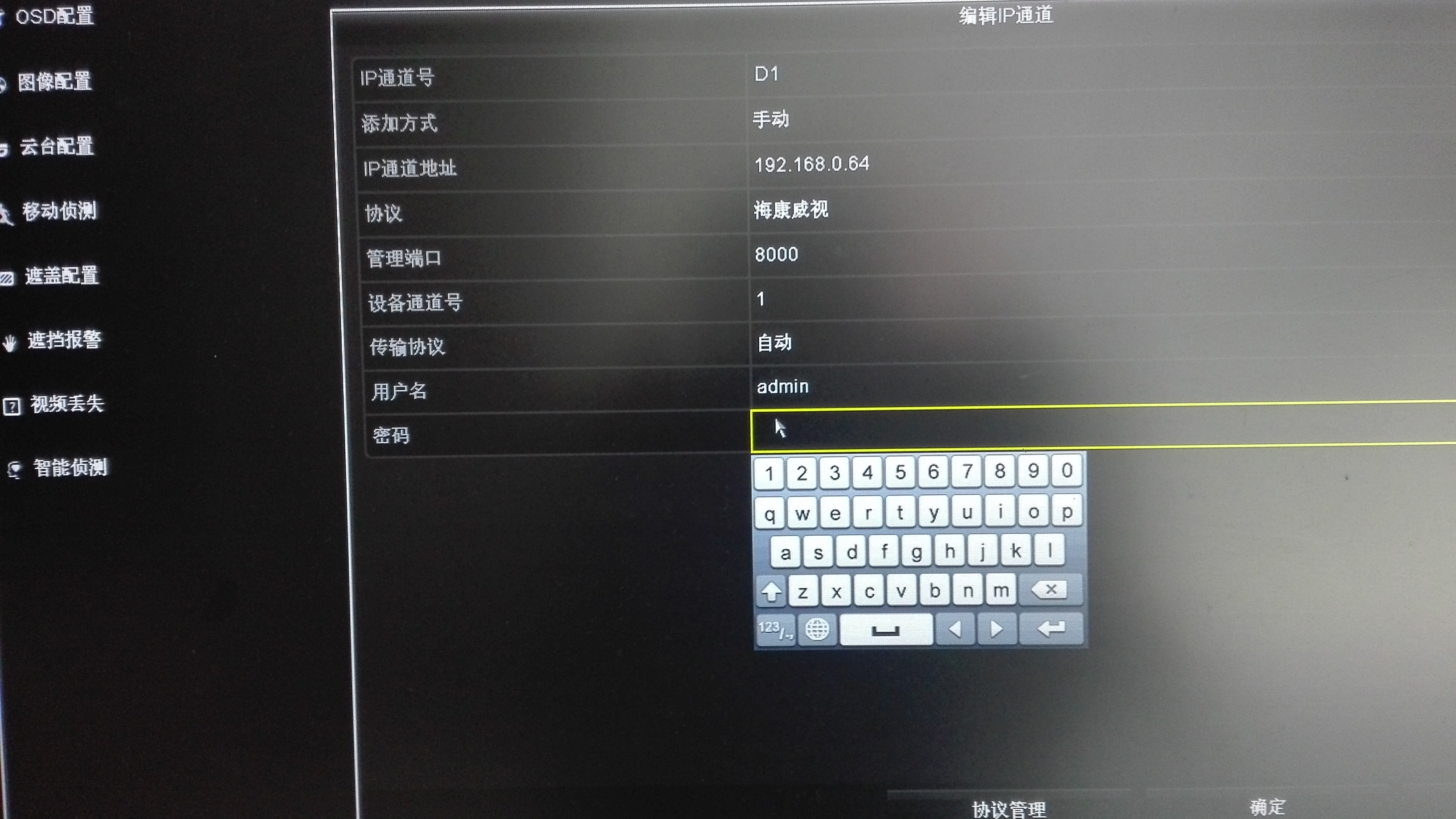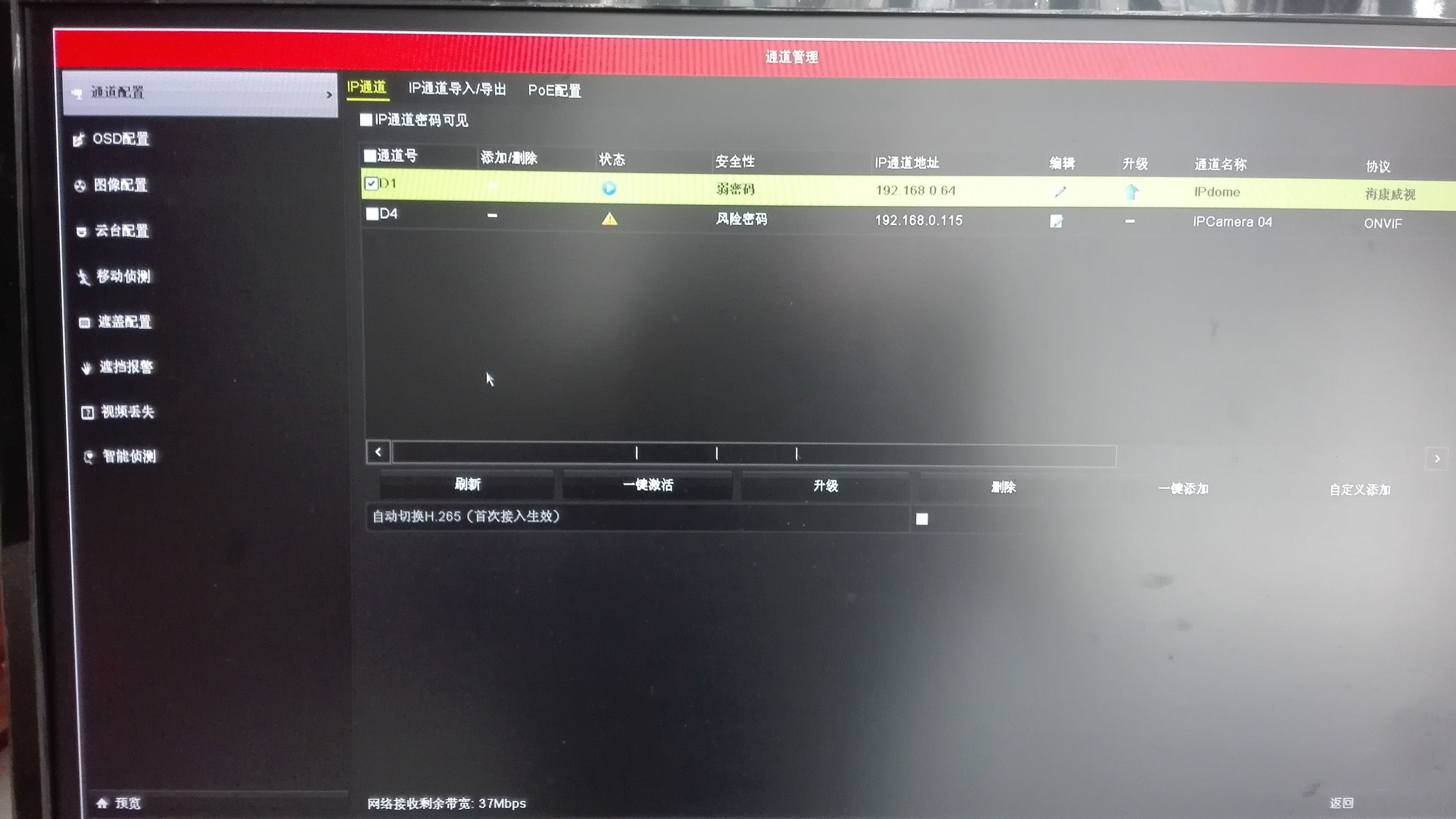 正确配置完密码之后,按“确定”,回到上面的IP通道页面,看到列表中的通道1的状态图标改变了,如果登录IPC成功,则通道的状态显示类似“点播”按钮的图标。