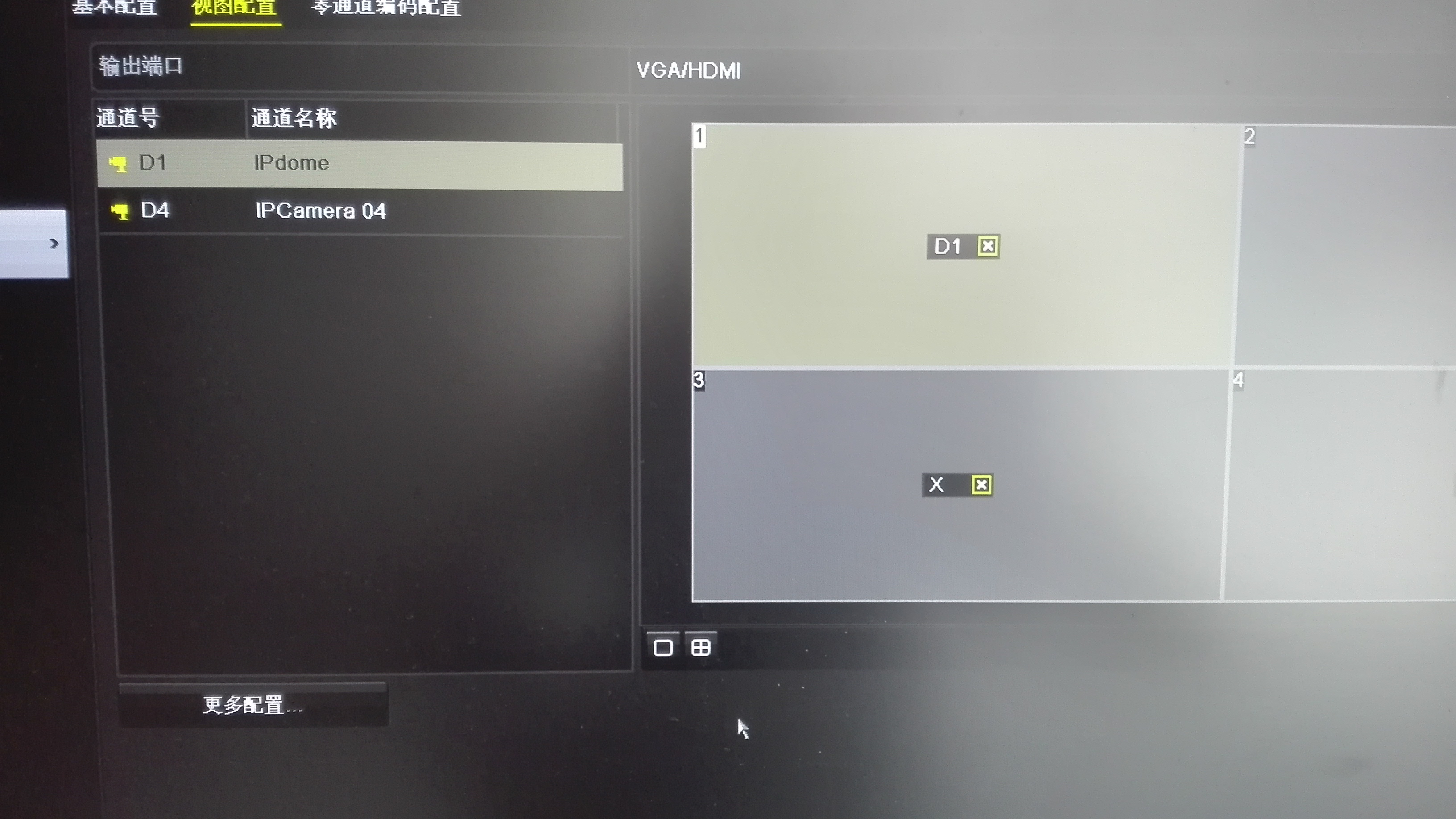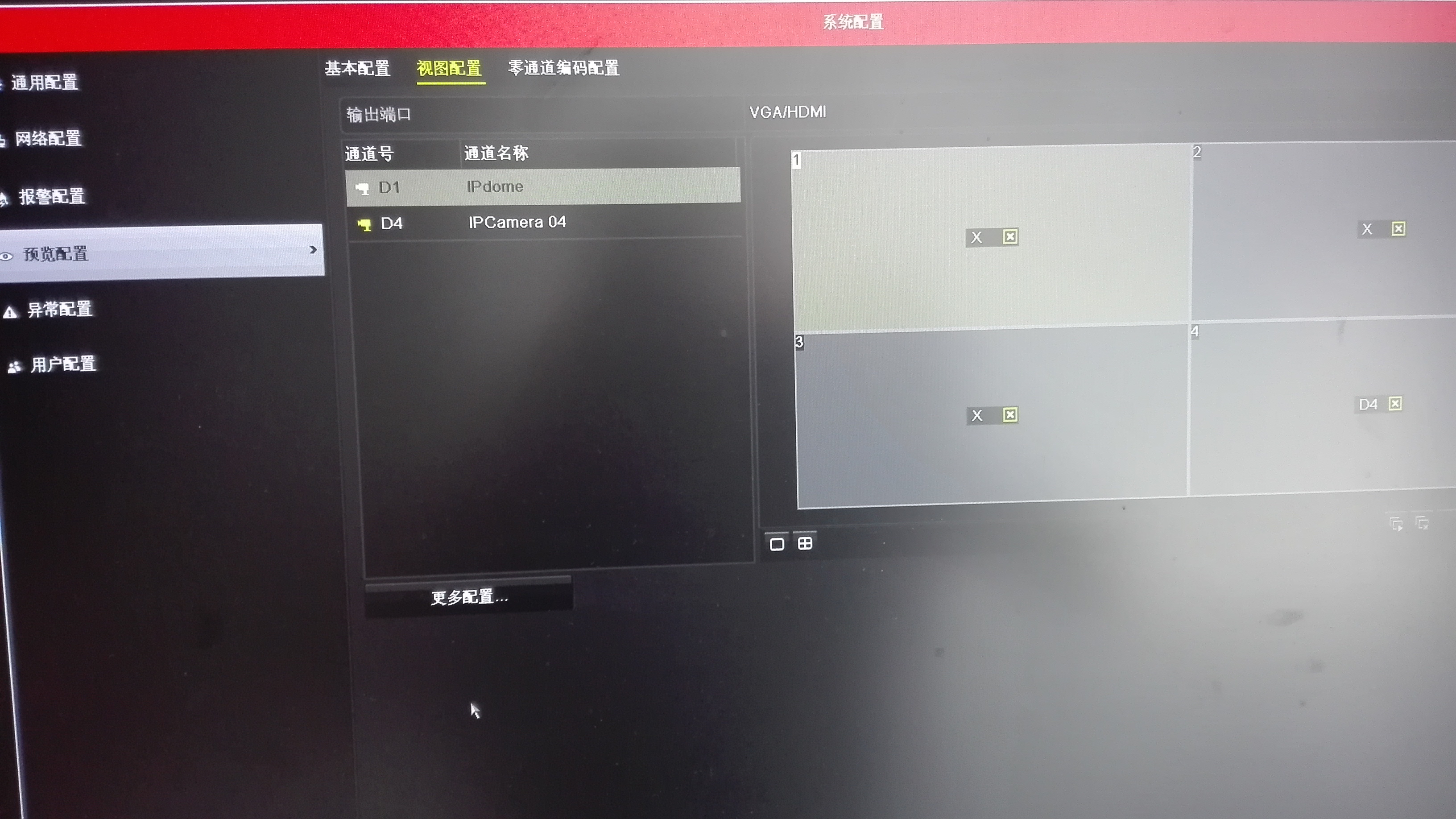 但是回到主屏幕,我们可能还不能看到IPC的视频,这可能是因为通道的预览视频开关默认关掉了,我们需要把通道的预览状态开关给打开。我们右键点击主菜单,然后点击“系统配置”,进去“系统配置”页面的“预览配置”一栏,选择刚才我们配置的通道,在右边的四个窗口中选择其中一个然后点击一下。