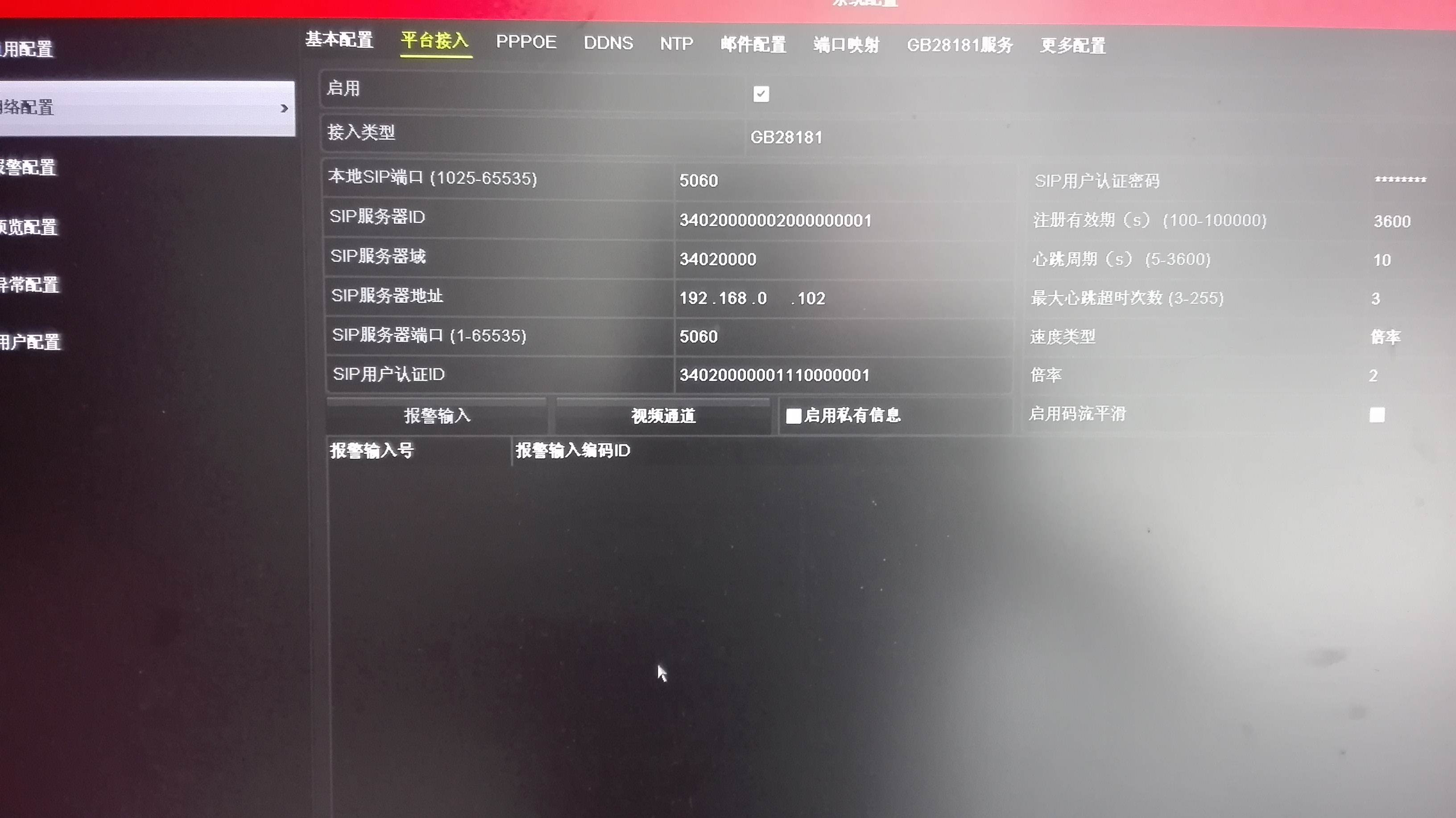 注意:这里是NVR是GBServerPlatform的下级设备,即它要向我们的平台进行注册(海康NVR也可以作为SIP信令服务器,让其他设备注册上去,但该教程中没有演示该用法)。平台配置页面如下图: