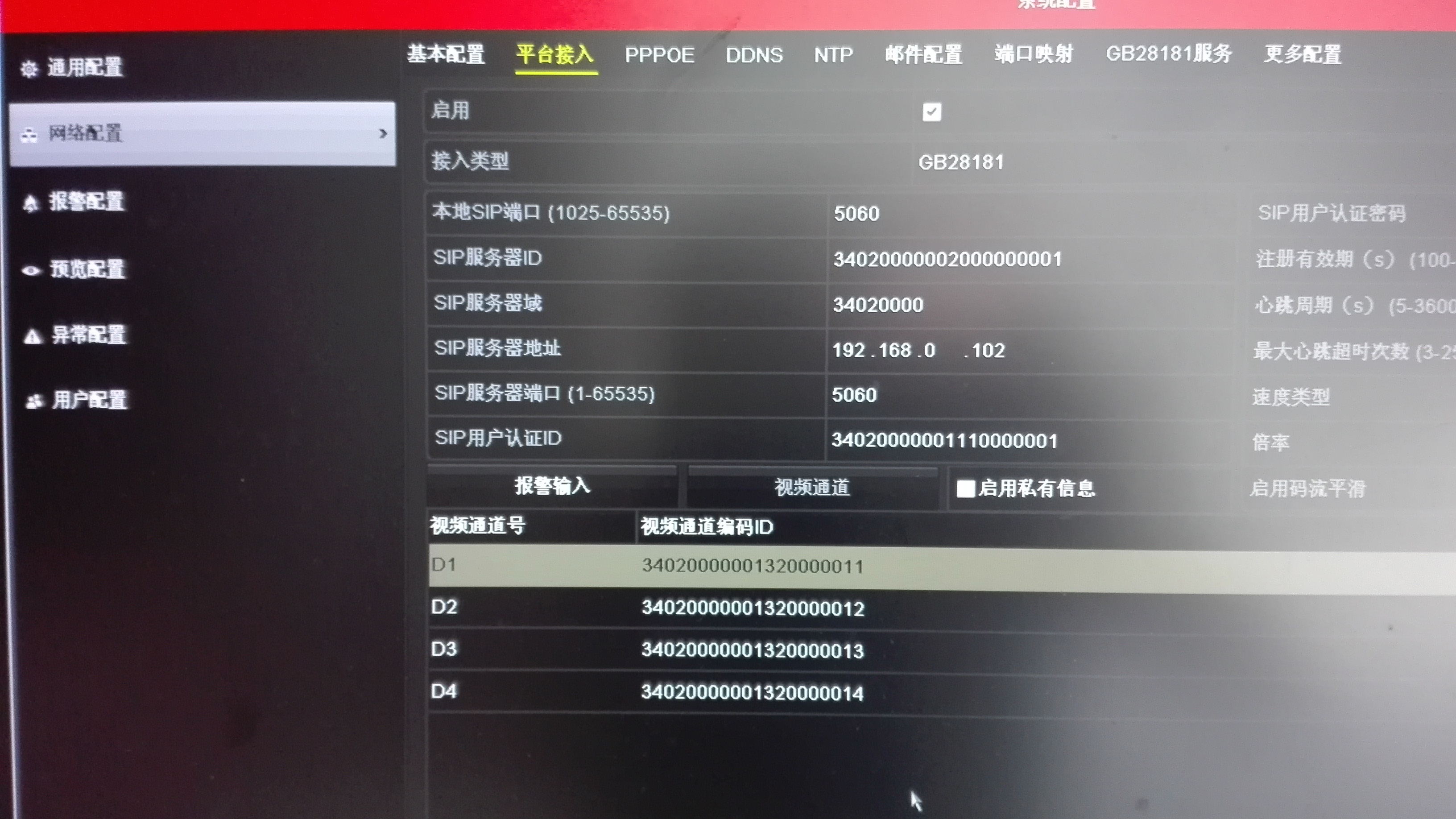 配置的选项跟国标IPC的很多都是一样的,但是NVR比IPC多了一些设备子通道。例如,我这个NVR有四个通道,四个通道都分配了一个国标的设备ID。你可以点击下面的”视频通道“按钮,看看有哪些视频通道: