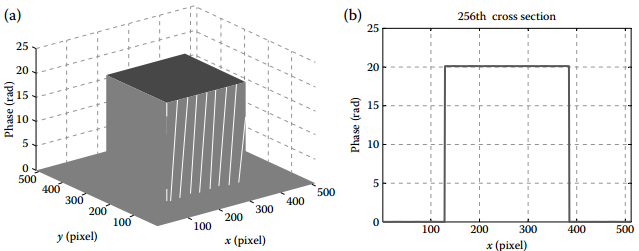测量一个高度已知(10mm)的立方体物体,上平面与下平面垂直,利用相移法测量该物体以获得解包裹后的相位图,假设相位图如下: