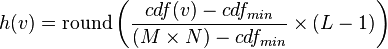 累积分布函数最小值cdfmin在本例中为1, M和N分别代表了图像的长宽像素个数(本例中为8×8=64),而L则是灰度级数(如本例中,图像为8位深度,则灰度级数共有2^8=256级数,这也是最常见的灰度级数).
