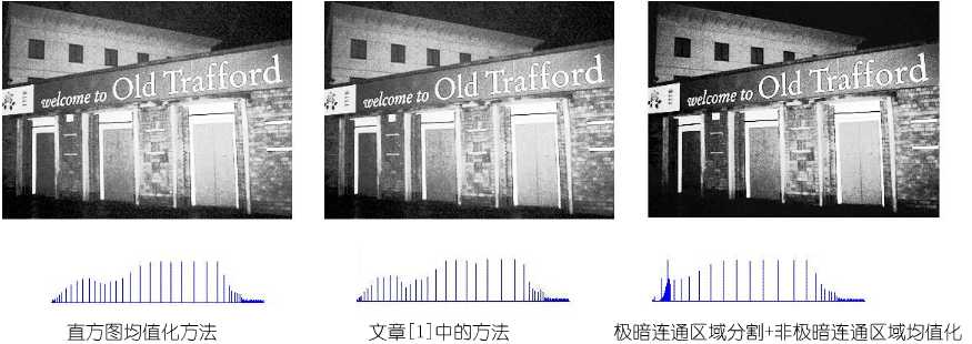 从实验结果的对比中,可以看出:直方图均值化方法使得画面稍亮,而文献[1]的方法除了会带来噪声外,亦在细节处使得画面有些模糊感,本文提出的“极暗连通区域分割+非极暗连通区域均值化”(简称DPEQU)方法,具有对比明显,重点突出的优点。