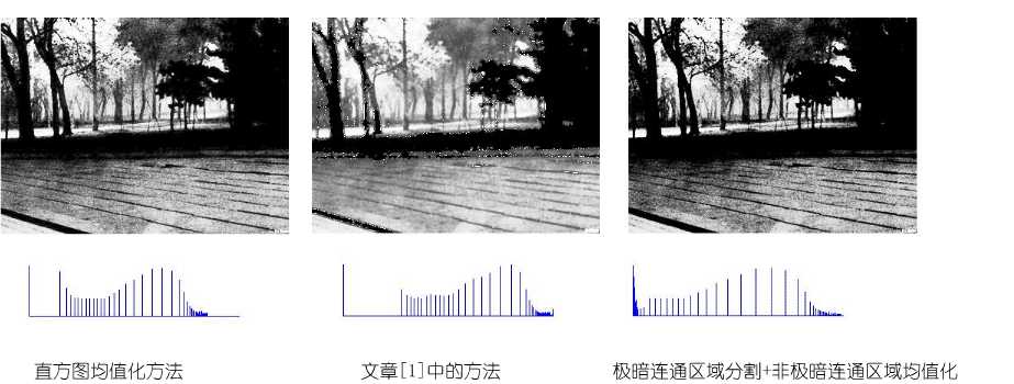 经过对比后,发现仅使用DPEQU方法仍有一些不足之处,如:一些位于极暗区域附近的像素,很容易在视觉上被极暗区域“吞噬”,从而丢失相应的信息。所以,考虑采用非线性动态范围调整方法先对画出进行调整,再用DPEQU,于是得到了 “非线性动态范围调整+极暗连通区域分割+非极暗连通区域均值化” 增强方法(简称DADPEQU)。