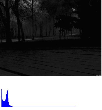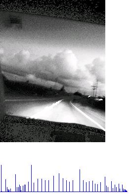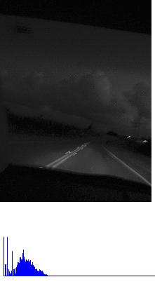 该算法的想法是基于夜间图像的有较大的连通区域是暗区得出的,所谓暗区,是指某幅图像中最暗灰度像素的个数占总像素个数的一定百分比内(不妨设为p )的所有像素。下面是三幅测试图像及其灰度柱状图(注:由于个别像素所占比例过大,因此此处的灰度柱状图采取了“限高”处理):