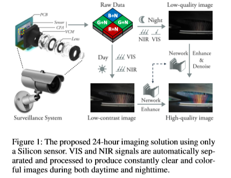 为了克服这一局限性,现有的大多数解决方案都使用额外的近红外(NIR)照明来照亮物体并捕获它。然而,对于这些系统来说,NIR是一把双刃剑。一方面,它利用了硅传感器在700nm-950nm之间的灵敏度,允许在黑暗中获取视觉信息。另一方面,它会影响可见光谱(VIS)信息的获取,导致彩色图像质量下降。