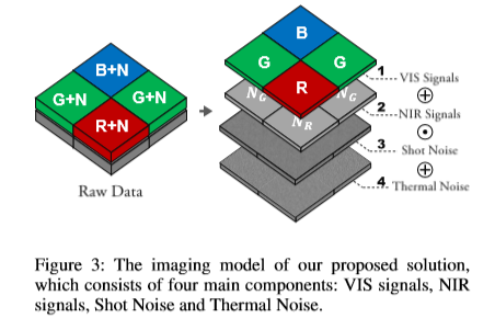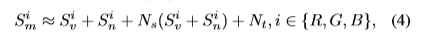 到目前为止,公式5和公式6模拟了两个主要组件,即式4中的Sv和Sn(论文中好像是写错了),它们显然分别依赖于Iv和In。至于Iv,它在白天变化明显而且能够被Sv显著影响。当Iv不足时,它将具有较低的信噪比。然而,由于存在额外的近红外照明,In是一个稳定的大值,因此Sn稳定且具有较高的信噪比。