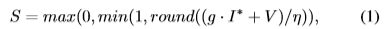 其中g是放大因子,V是偏置电压,η是量化步长。符号I*是释放的电子,其无噪声版本可表示为: