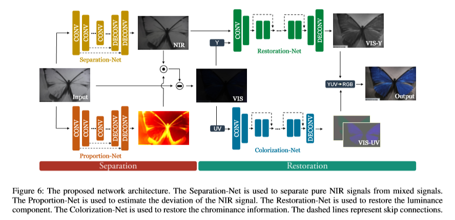 基于以上分析,我们建议分离Sv+Ns(Sv)和Sn+Ns(Sn),并借助高质量的NIR信号增强VIS信号。由于Sn+Ns(Sn)的稳定性,使分离成为可能。然后我们的想法是,在白天,当Iv和In都很大时,噪声可以忽略不计,而在夜间,当Iv变小,In仍然很大时,问题就变成了用高质量的NIR信号提供的信息(例如场景结构)来恢复VIS信号。通过这种方式,集成解决方案可以在24小时内生成高质量的图像。据我们所知,这是第一个此类解决方案。