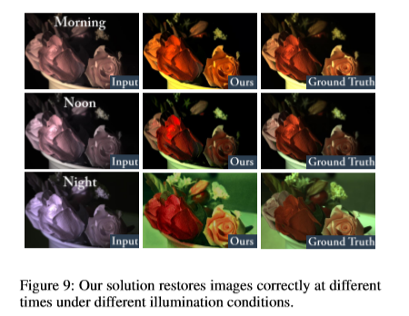 定性和定量实验都表明,我们提出的解决方案能够在充足的阳光和极低光照的场景下生成彩色清晰的图像,优于现有的解决方案。总体而言,我们的主要贡献有三个方面: