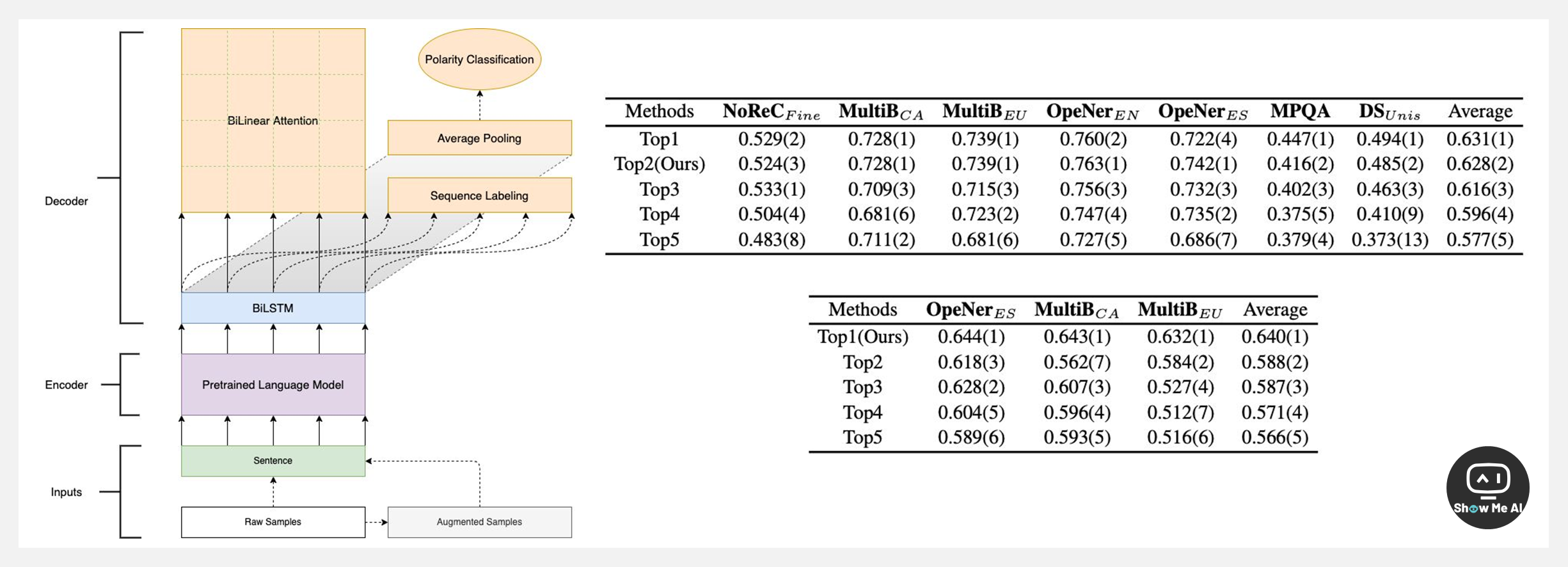 文章作者提出了统一的端到端 SSA 模型,把 PLM 作为模型主干参与到整个端到端的训练中,并且利用数据增强方法和辅助任务来大幅提升跨语言 zero-shot 场景的效果,并添加了序列标注任务(Sequence Labeling)和情感极性分类(Polarity Classification)两个辅助任务。实验证明了方法和模型的有效性,在两个子任务中分别获得了第2名和第1名的成绩。