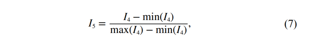 5、其中I4是来自修改后的CDF-HSD方程的结果图像。 进行的修改在提高亮度方面明显有助于提高功能的处理效率。首先,增加误差函数(erf)来增加CDF-HSD方程的曲线变换,这对提高暗图像区域的亮度非常有利。利用λ代替π/2来控制增强量,增强量应满足2≤λ≤7,数值越高,输出图像的亮度越高。再减去0.5 × I3的值帮助调整图像的色调,使其看起来与观察到的场景非常相似。尽管如此,图像I4的像素分布仍然限制在特定的动态范围内,并且从该步骤得到的图像看起来非常白。 因此,应用归一化函数来线性缩放像素值以适合标准范围。 使用的归一化函数计算如下: