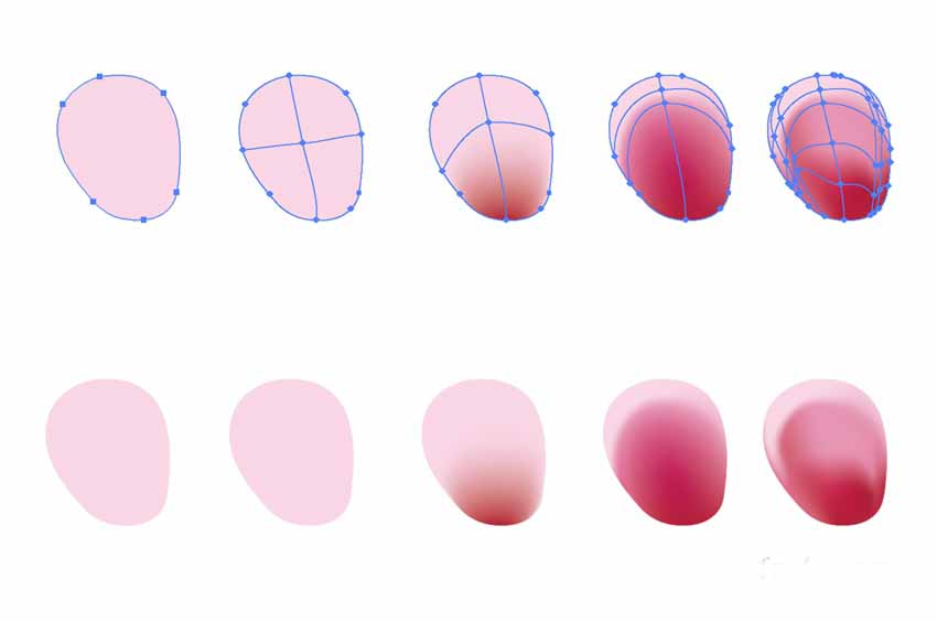 使用网格工具给花瓣循序渐进上色,步骤请参考下图。