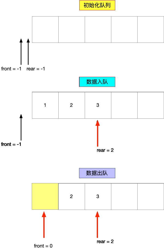 在上面的队列构造中,存在一个最大的问题就是,当数据入队到数组的最大容量后,此时rear=MaxSize-1,表示队列已满。数据出队后,前面的空间(图上变黄的地方)虽然空出来了,但是依然无法插入数据进去。这样构造的队列每个空间只能利用一次。