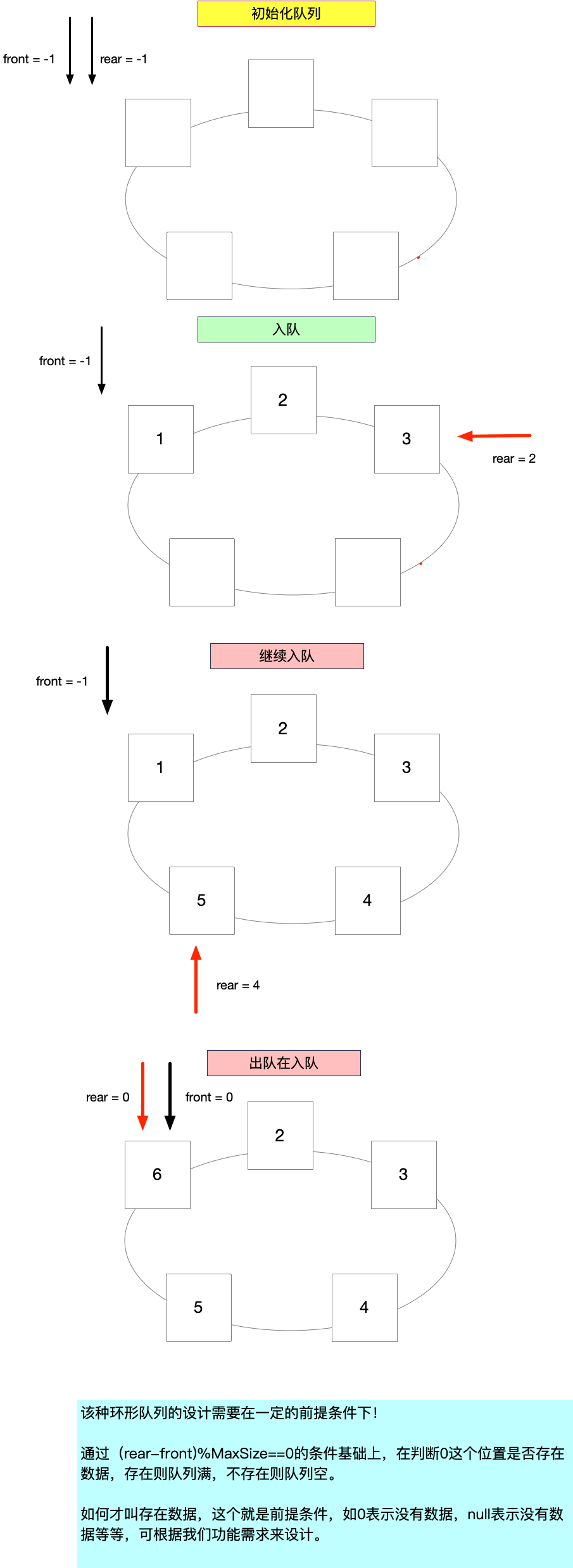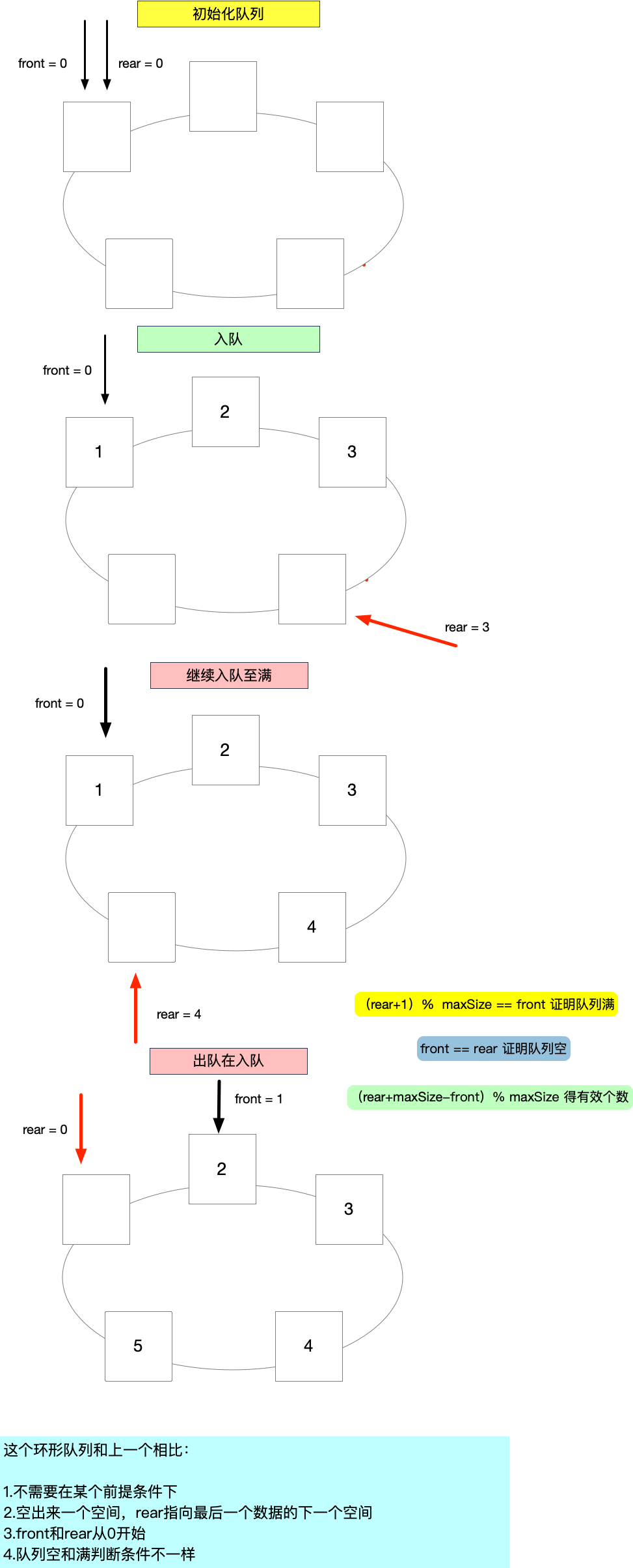 return (rear-front)%maxSize==0&&arr[0]!=0; //值等于0表示此空间没有数据作为前提条件