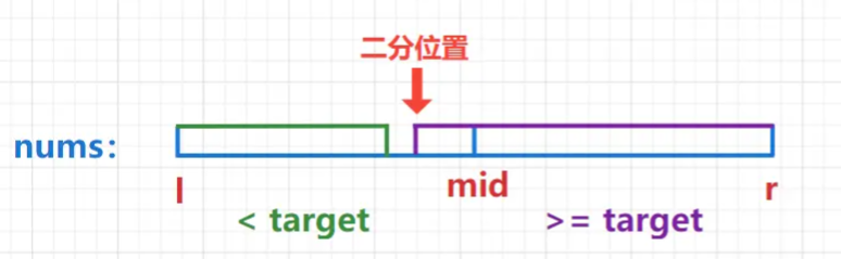- 1、二分的范围,l = 0, r = nums.size() - 1,我们去二分查找>=target的最左边界。