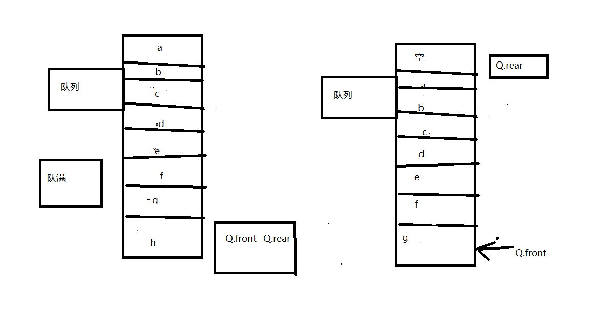 - 在这两种结构下都是队列满,但是第二种是Q.rear指向空,下一位是Q.front才代表队列满。所以牺牲了一个空间,而这种情况下,Q.rear=Q.front代表队列空,也就区分开了,还可以把Q.front指向空下一位是第一个元素,这样的话,就会出现Q.front下一位是Q.rear代表空,而Q.rear=Q.front代表队列满,这与刚刚的方式是相反的。