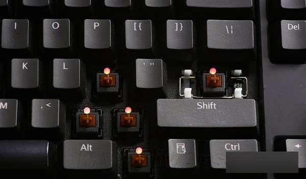 从结构说,机械键盘键帽下面由塑料做的轴承和弹簧制作而成,每一个按键都有一个单独的开关来控制闭合,这个开关被称为“轴”,每一个键下面是一个单独的信号,因此机械键盘不会有键位冲突。