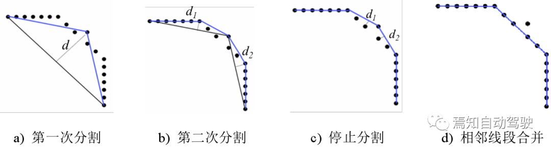 在分割阶段,首先从给定的点集中拟合出一条直线。然后找出点集中到拟合直线距离最远的点,计算该点到拟合直线的距离作为拟合误差,如果拟合误差大于设定的距离阈值,则从点集中按照某种规则找出一个点,将直线从该点处进行分割。不断重复这个过程直到拟合误差小于设定的距离阈值则不再分割。在合并阶段,如果相邻的两条线段的拟合误差小于距离阈值,就将这两条相邻线段合并成一条线段。