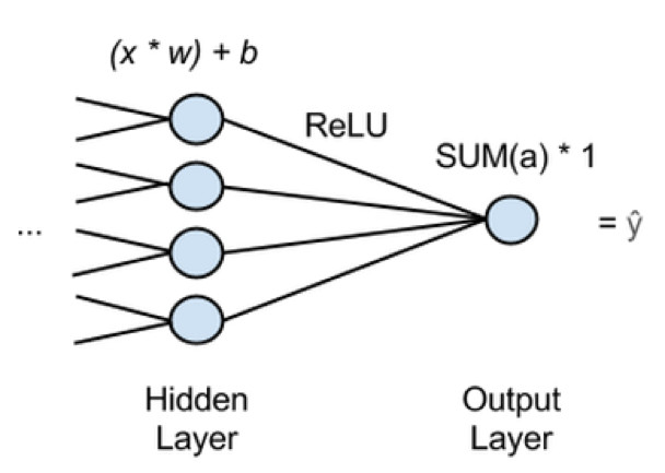 在上面的图表中,x 代表输入,特征从网络中的前一层传递到下一层。许多 x 将输入到最后一个隐藏层的每个节点,并且每一个 x 将乘以相关权重 w。