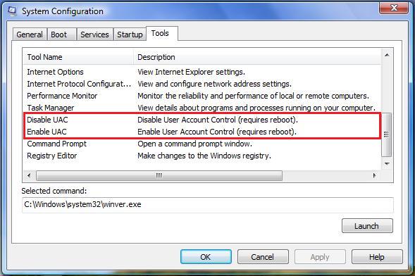 msconfig提供了启用、禁用UAC功能的两个选项,选中,然后点击Launch按钮,就设定成功了。启用新的设置需要重新启动计算机。