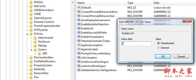 在注册表的HKLM\SOFTWARE\Microsoft\Windows\CurrentVersion\Policies\System 下EnableLUA 键是用来控制UAC功能的启用和暂停,1代表启用UAC功能;0代表禁用UAC功能。这也就不难解释为什么修改UAC设定后,需要重新启动计算机了。