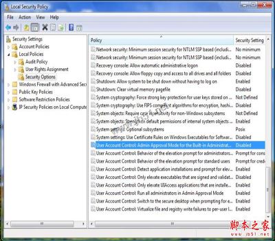 在开始菜单->运行->输入"secpol.msc" 启动本地安全策略控制台。在"本地安全策略"(Local Policies)节点下"安全选项"(Security Option)子节点中有9个UAC相关的策略。