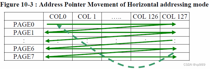 在水平寻址模式下,当显示 RAM 被读写之后,列地址指针自动加一。如果列地址指针达到列的结束地址,列地址指针重置为列的开始地址,并且页地址指针自动加 1。水平寻址模式下页和列地址的移动顺序如下图所示。当列地址和页地址都达到了结束地址,指针重设为列地址和页地址的开始地址。