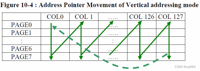 在垂直寻址模式下,当显示 RAM 被读写之后,页地址指针自动加一。如果页地址达到了页的结束地址,页地址自动重置为页的开始地址,列地址自动加一。页地址和列地址的移动顺序如下图所示。当列地址和页地址都达到结束地址后,指针自动重置为开始地址。
