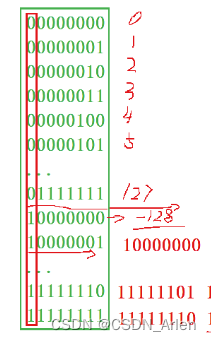 左图就是代表八个bit位从00000000到11111111所存储的大小,有图是左图最下面几个数的补码。总结来说char存储的整形大小就是-128到127。