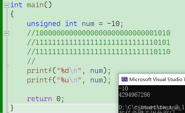 来看这里-10不变,我们加一个printf语句用%u来打印出来,发现也不是10。这是为什么。