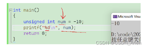 其实这里的原理跟unsigned char差不多,你原本的-10是有符号位的。如图,我们按负数变成补码,这个时候这个补码就被当做了num的原码,num是无符号的,所以补码也是这个,所以最终打印出来的结果不是10。