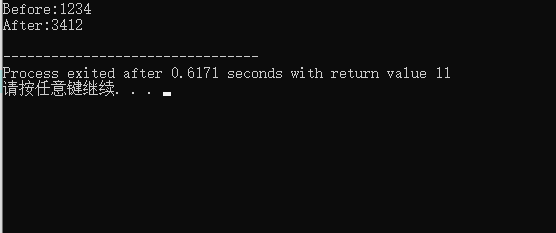 #include<stdio.h> int main() { union date { short i; char c[2]; }; union date x; char tmp; x.i=0x1234; short a=0x1234; printf("Before:%xn",a); tmp=x.c[0]; x.c[0]=x.c[1]; x.c[1]=tmp; printf("After:%xn",x.i); }