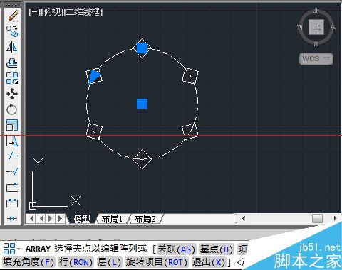 4、上一步中心点选定后,绘图区域显示了在辅助圆周上,均匀地分布着6个正方形。命令栏出现了“选择夹点以编辑阵列或 [关联(AS)/基点(B)/项目(I)/项目间角度(A)/填充角度(F)/行(ROW)/层(L)/旋转项目(ROT)/退出(X)]”的指令。