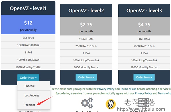 这里我们可以看到上图所示中Pzea最低年付12美金(256MB内存、15GB硬盘、1个IP、100Mbit带宽、月500GB流量),根据需要选择配置方案,以及每个方案有3个机房,分别是凤凰城Phoenix、洛杉矶Los Angeles、佛利蒙Fremont。