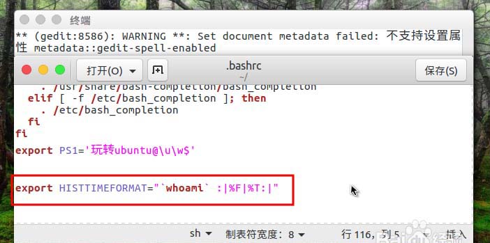4、在最后我们加入export HISTTIMEFORMAT=" %F %T "或者也可以使用export HISTTIMEFORMAT=”[%Y.%m.%d %H:%M:%S] ”