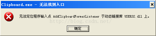 如果出现如下图所示“无法定位程序输入点AddClipboardFormatListener于动态连接库USER32.dll上。”的情况,建议使用::LoadLibrary和GetProcAddress函数手动加载一个与“C:WINDOWSsystem32User32.dll”版本不一致新的DLL,可以去网上下载也可以从别的电脑系统里面拷贝,一般情况您找到的User32.dll是无法替换“C:WINDOWSsystem32User32.dll”,因为有太多的程序占用了“C:WINDOWSsystem32User32.dll”,所以想要替换这个dll一般都要重装系统。所以放在自己程序的同一个目录下就行了,如果还是加载失败,很有可能你的系统不兼容这个dll,如果不想安装电脑请使用别的电脑。经测试xp上“5.1.2600.5512”不含有该接口函数,win7“6.1.7601.17514”拥有该接口函数。