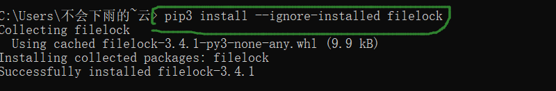 在命令中输入 pip3 install --ignore-installed filelock 这个是强行升级的