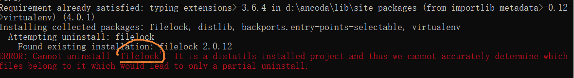 ERROR: Cannot uninstall 'filelock'. It is a distutils installed project and thus we cannot accurately determine which files belong to it which would lead to only a partial uninstall.