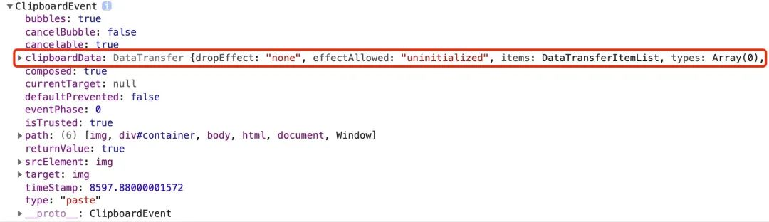通过上图可知,在 ClipboardEvent 对象中含有一个 clipboardData 属性,该属性包含了与剪贴板相关联的数据。详细分析了 clipboardData 属性之后,我们发现已复制的图像和普通文本被封装为 DataTransferItem 对象。