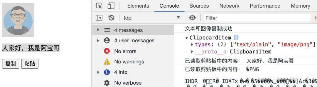 对于上述代码,当用户点击 读取剪贴板中的内容 按钮时,则会开始读取剪贴板中的内容。到这里 clipboard 对象中涉及的 4 个 API,阿宝哥都已经介绍完了,最后我们来看一下如何实现复制图像的功能。