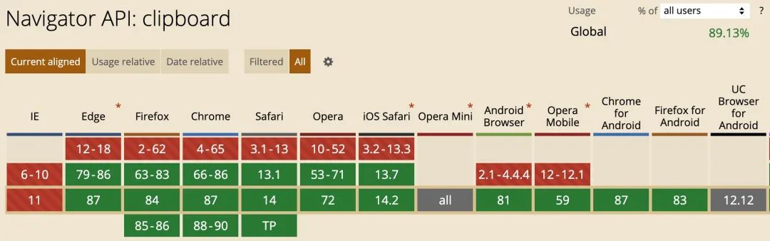 在继续介绍 Clipboard API 之前,我们先来看一下 Navigator API: clipboard 的兼容性: