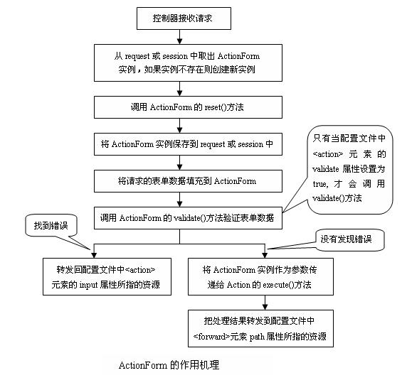 Struts框架利用ActionForm对象来临时存放视图页面中的表单数据。例如一个登录页面会有一个用户输入框和一个密码输入框,以及用来提交登录请求的按钮。当用户提交登录请求后,Struts将用户名和密码两个输入域的数据自动填充到相应的ActionForm对象中,然后控制层可以从该ActionForm对象中读取用户输入的表单数据,也可以把来自模型层的数据存放到ActionForm中,然后返回给视图显示。