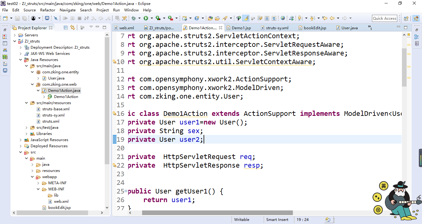 3、在Demo1Action类中实现ServletRequestAware ,ServletResponseAware两个接口进行集成: