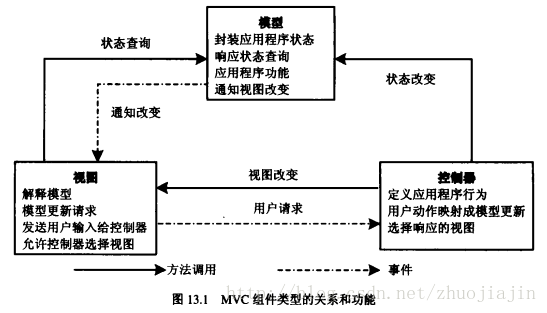 作为MVC的一个实现,学习之前我们先简单的回顾一下MVC的内容。MVC架构模式,将一个应用程序的出入、处理、输出流程分为:模型层、视图层、控制层。MVC模式下的各层关系和功能如下图(注:图片来源于《征服JSP企业网站开发》443页):