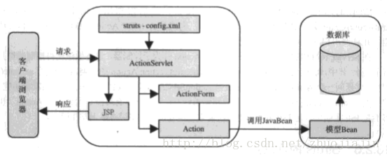 Mode1和Model2只是概念,Sturts则是实现。Struts是MVC的一种实现,说的准确一点应该是Model2的实现。直接看图吧: