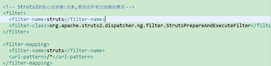 1) 当Web服务器接收到请求之后,将请求交由web.xml中配置的struts2框架的核心过滤器StrutsPrepareAndExecuteFilter.