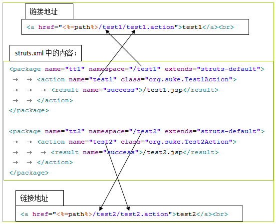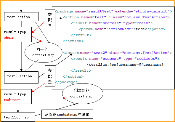<package name="resultTest" extends="struts-default"> <action name="test" class="com.asm.TestAction"> <result name="success" type="chain"> <param name="actionName">test2</param> </result> </action> <action name="test2" class="com.asm.Test2Action"> <result name="success">/test2Suc.jsp</result> </action> </package>
